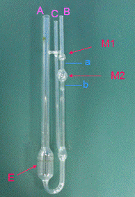 (b)用移液管加入4ml預(yù)先恒溫好的甲苯,對(duì)上述溶液進(jìn)行稀釋,稀釋后的溶液濃度(c2)即為起始濃度c1的2/3。然后用同樣的方法測(cè)定濃度為c2的溶液的流出時(shí)間t2。與此相同,依次加入甲苯4ml、4ml、4ml,使溶液濃度成為起始濃度的1/2、2/5、1/3,分別測(cè)定其流出時(shí)間并記錄下來。注意每次加入純?cè)噭┖螅欢ㄒ旌暇鶆颍看蜗♂尯蠖家獙⑾♂屢撼橄凑扯扔?jì)的E球、毛細(xì)管、M2球和M1球,使粘度計(jì)內(nèi)各處溶液的濃度相等,且要等到恒溫后再測(cè)定。
